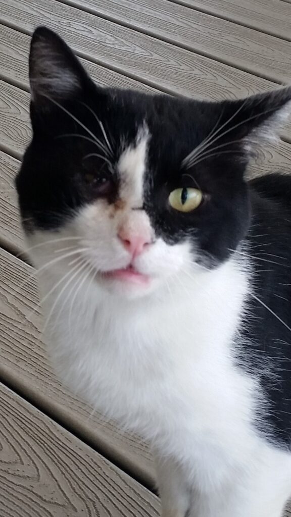 It took months of patience and quiet kindness before he trusted us enough to be touched. When our vet finally examined him, he told us Percy was “one of the worst abuse cases” he had ever seen personally. He needed several surgeries, including the removal of one eye, and carried BB pellets still lodged in his skin.