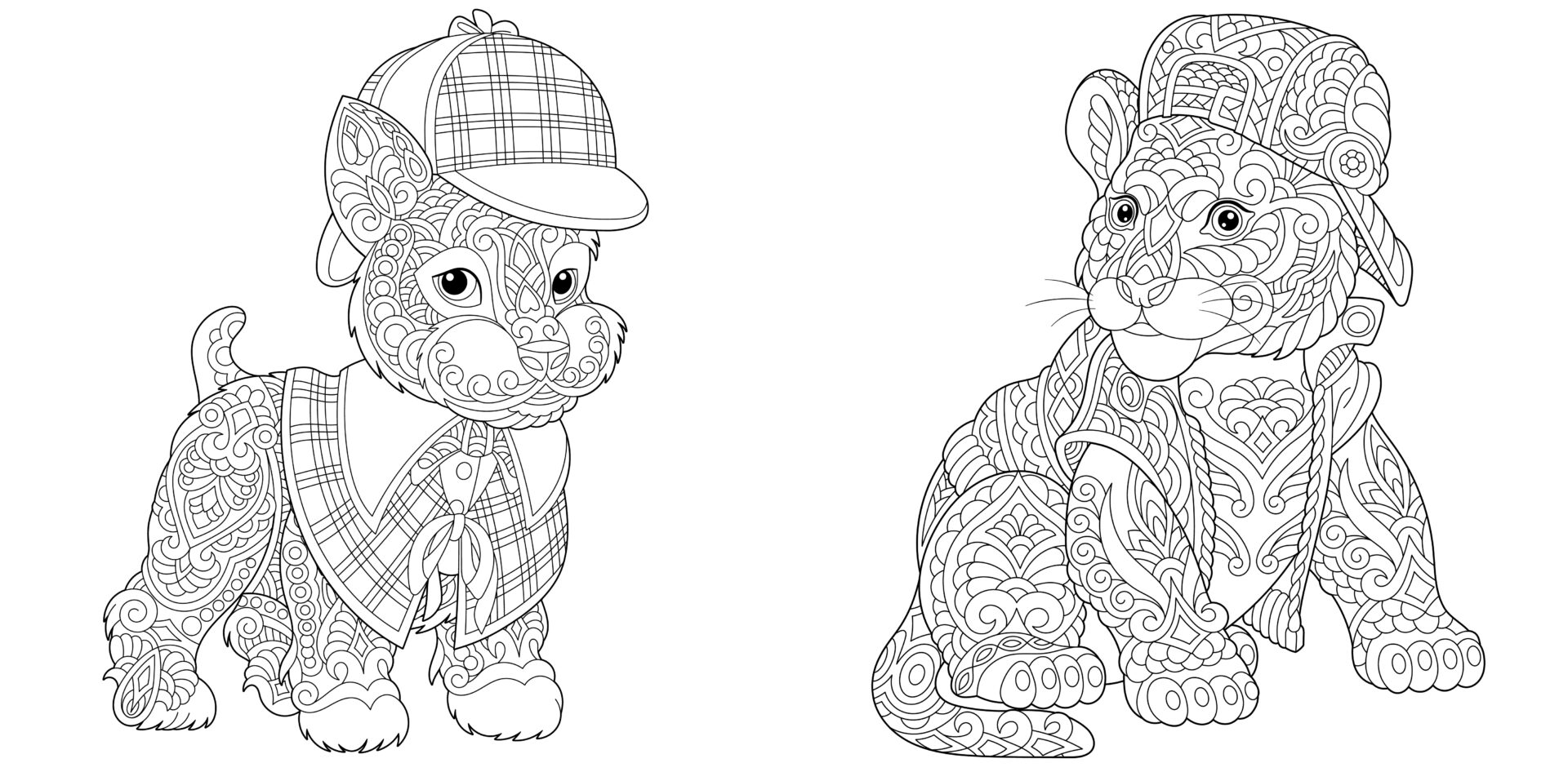 A charming coloring duo featuring Detective Dog and his trusty tiger-cub sidekick—the most unlikely (but enthusiastic!) sleuths in town.