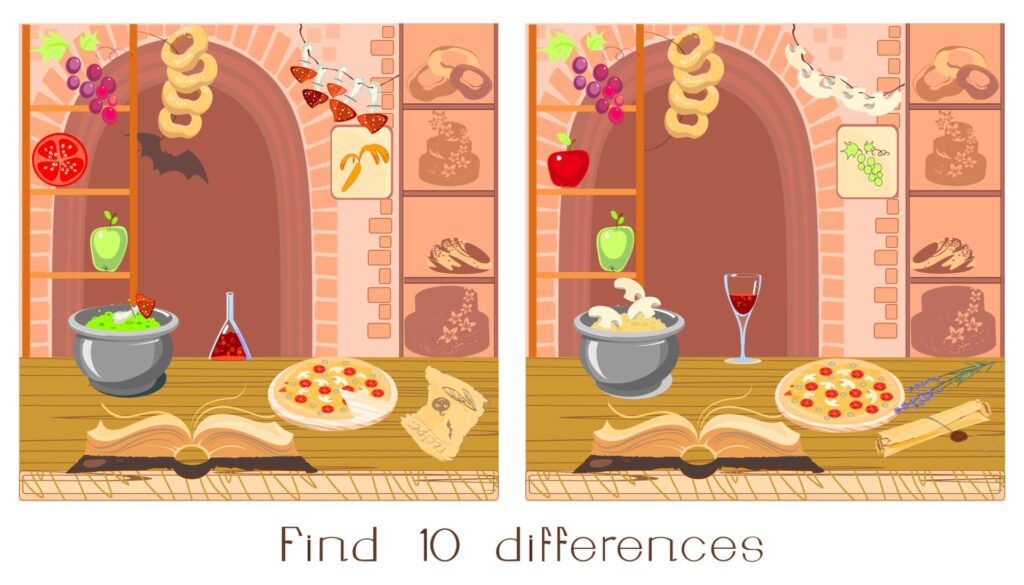 Search both enchanted kitchen scenes and find all 10 differences hidden among: